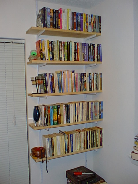 When I was visiting djbp and bardling last month, I got to admiring the wall mounted track shelving they had up for bookstorage in one of the upstairs rooms. It occurred to me that this could be the answer to our problem. Since it was wall mounted, I could simply have shelves cut to whatever length I wanted on that part of the wall, and since they didn’t have to reach all the way to the floor, they could be placed above other furniture.