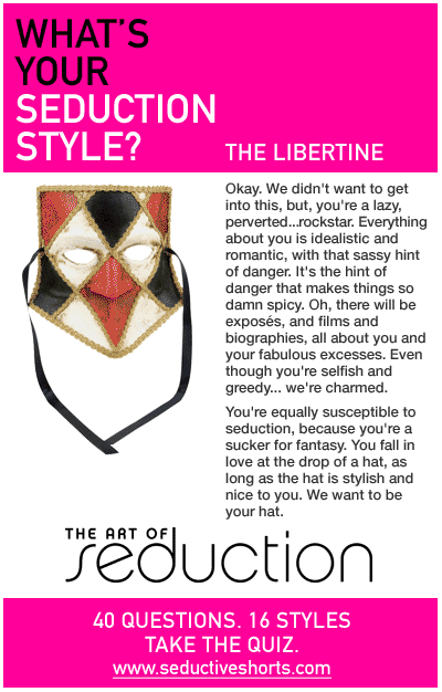 Silly seduction style quiz By autographedcat On November 29, 2008 In Blog Well, it has a lot of binary questions that don’t necessarily have binary answers, but it was amusing nevertheless. Fitting? I dunno, you tell me… meme Previous Gafilk! Next I take it all back… 2 Comments Add Comment → joyeuse13 It was mausing? 😉 November 30, 2008 Reply celticdragonfly December 1, 2008 Reply Leave a Reply Cancel replyYour email address will not be published. Required fields are marked *Comment * Name * Email * Website Δ This site uses Akismet to reduce spam. Learn how your comment data is processed.